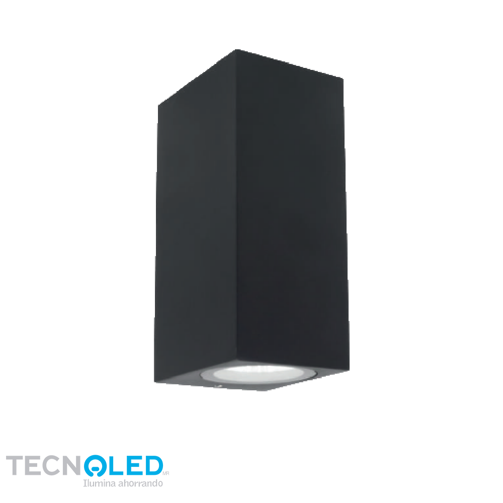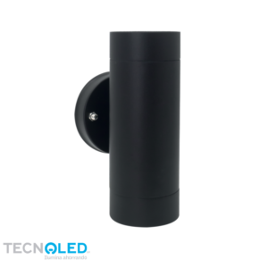 Lámpara LED para sobreponer en muro exterior, con tono de luz blanco frío y dos pantallas de vidrio redondas.