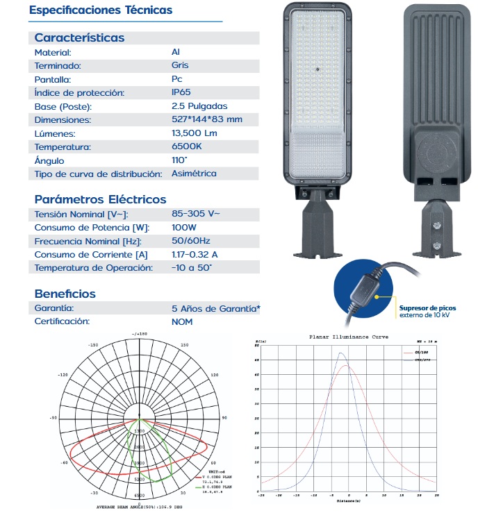 LUMINARIA PARA VIALIDAD, CON CINCO AÑOS DE GARANTIA, LUMENES 13500K Lm, TEMPERATURA DE 6500K