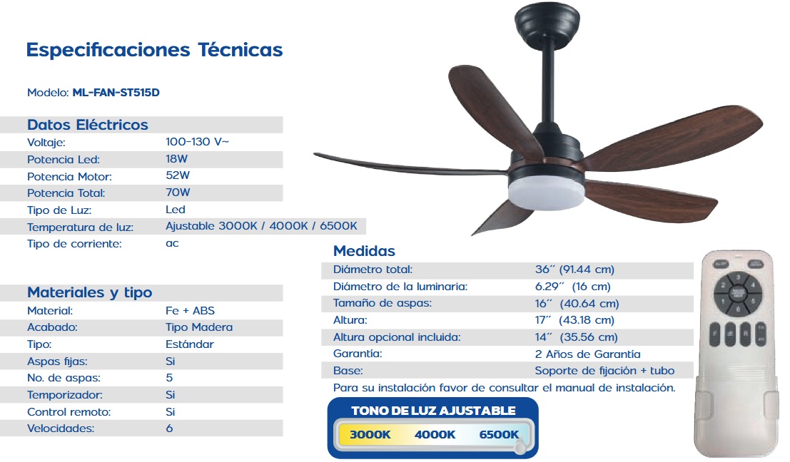 VENTILADOR LUZ AJUSTABLE, TONO DE LUZ, 3000K, 4000K, 6500K